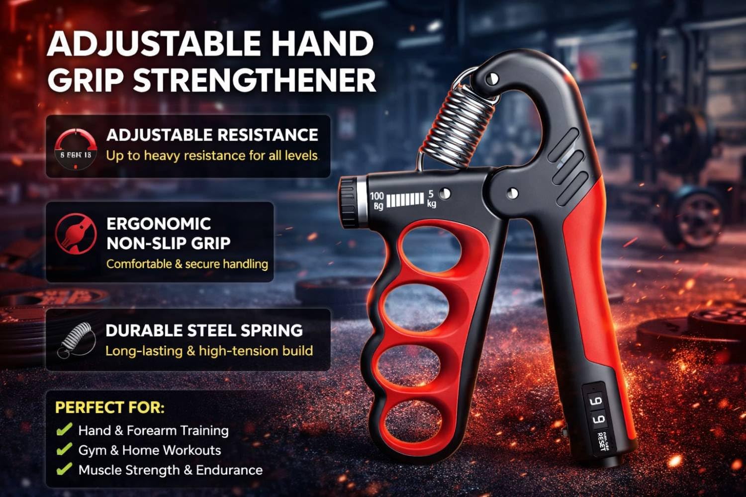 • 🔹 COMPTEUR INTÉGRÉ POUR LE SUIVI Doté d’un compteur facile à lire, cet appareil d’exercice pour les mains aide à suivre les répétitions pendant les séances d’entraînement pour une meilleure régularité de la routine.