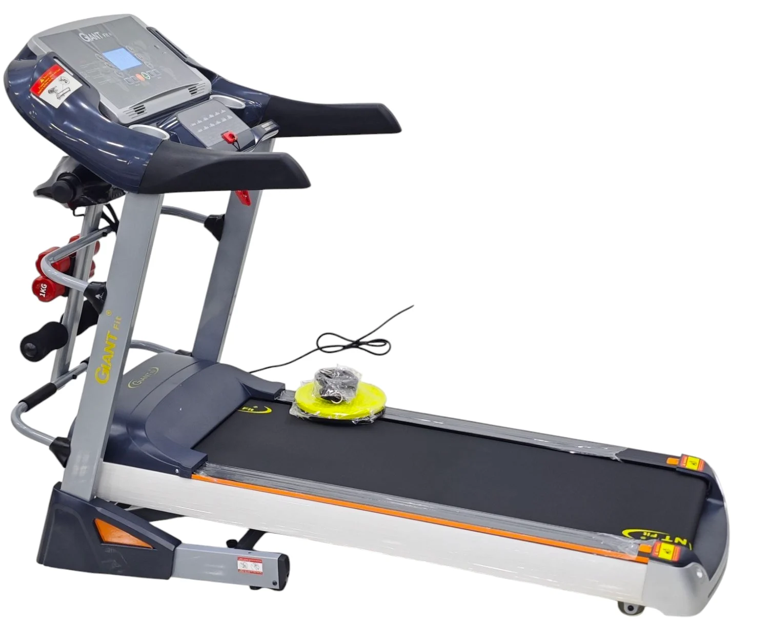 Tapis Roulant giant fit GF 9.38 : moteur 2.5HP (PEAK), 150 Kg , 18 km/h, surface de course 123 x 45 cm, inclinaison électrique 18%, pliable vertical et horizontal, roulettes de transport, vibromasseur, haltères, support ABS, USB, carte SD, entrée audio. Garantie , prix et Livraison en algérie .